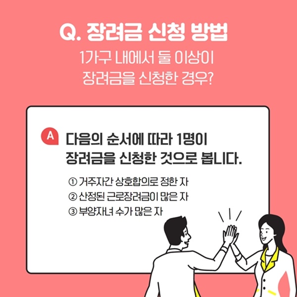 A: 근로장려금은 1가구에 1명에게만 지급됩니다. 신청요건을 충족한 자가 2명 이상인 경우 다음 순서에 따라 지급됩니다.
